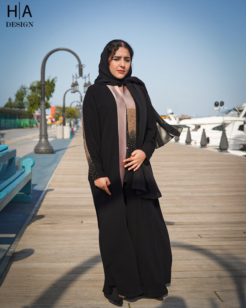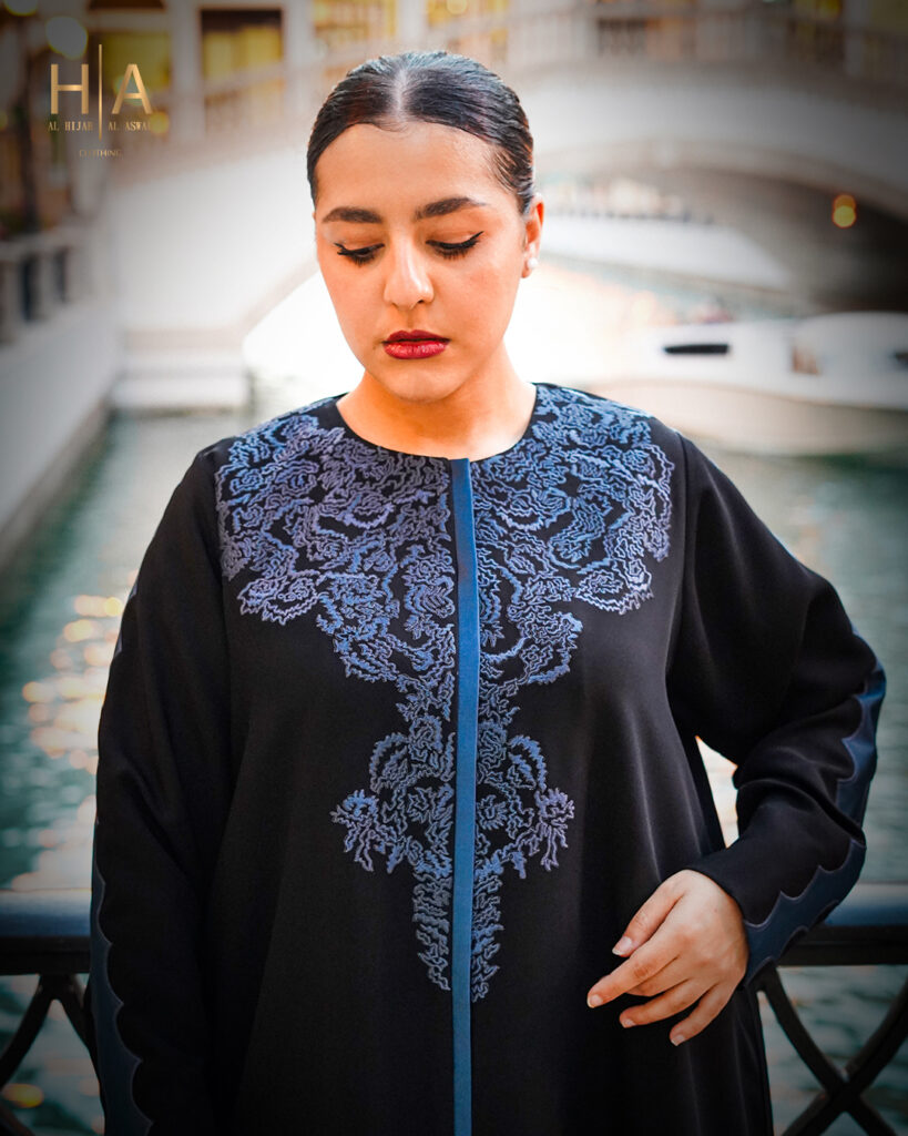 A statement abaya made with beautiful Musajjar fabric, highlighted with elegant Batang details. Rich texture and graceful drape make this piece stand out.